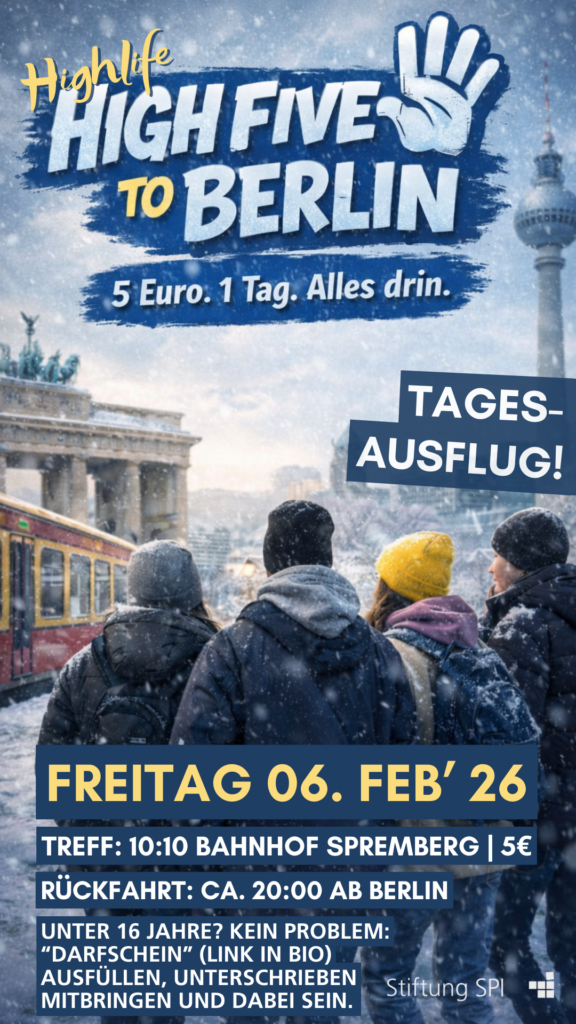 Am Donnerstag, den 06.02.2025, geht es gemeinsam mit der Bahn nach Berlin. Das Angebot richtet sich an Jugendliche ab 12 Jahren bis maximal 19 Jahre, die Lust haben, einen ganzen Tag in der Hauptstadt zu verbringen – ganz egal, ob zum Shoppen, Sightseeing, Skaten, Chillen oder zum Treffen von Freund:innen.